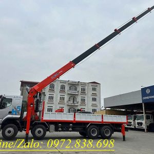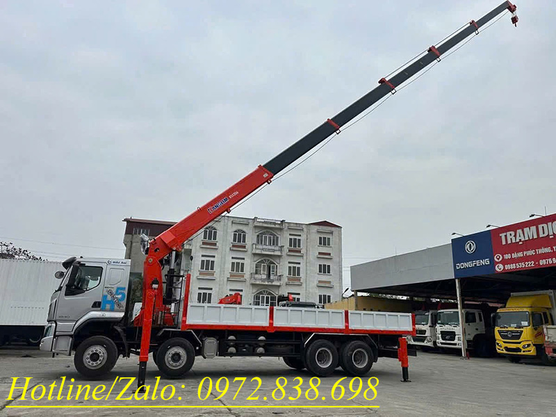 Chiếc xe tải gắn cẩu này nổi bật với khả năng nâng hàng nặng, bán kính làm việc rộng (25.3m), phù hợp thi công công trình, cẩu lắp máy móc. Thùng hàng kích thước 8050 x 2350 x 650 mm.
